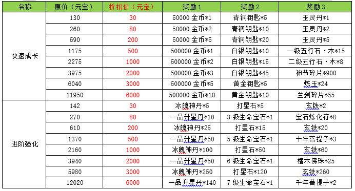 l 活动内容:玩家可以通过较低的元宝获得更高价值的成长道具和强化道具。