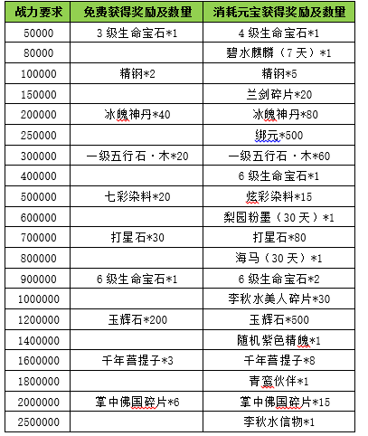l 活动规则:新服放利活动,增加战力奖励,符合条件的玩家可免费领取,消耗一定元宝还可领取进阶好礼,进阶好礼仅需1次绑定元宝解锁。