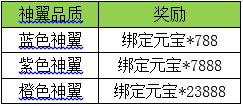 活动内容:活动期间内,神翼达到特定等级,将获得额外绑定元宝。
