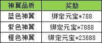 l 活动内容:活动期间内,神翼达到特定等级,将获得额外绑定元宝。