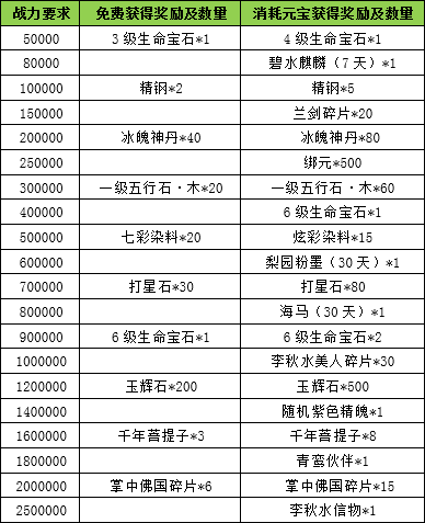 l 活动规则:新服放利活动,增加战力奖励,符合条件的玩家可免费领取,消耗一定元宝还可领取进阶好礼,进阶好礼仅需1次绑定元宝解锁。