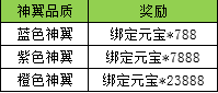 l 活动内容:活动期间内,神翼达到特定等级,将获得额外绑定元宝。
