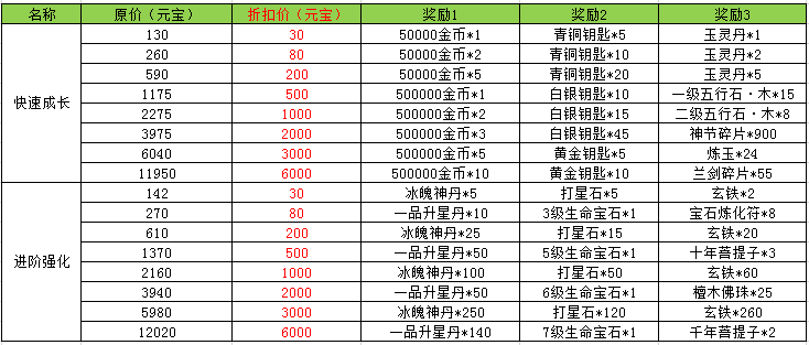 l 活动内容:玩家可以通过较低的元宝获得更高价值的成长道具和强化道具。