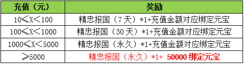 活动期间内,玩家累计充值达到一定金额,可获充值金额对应的绑定元宝+带属性图片称号。
