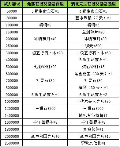 l 活动规则:新服放利活动,增加战力奖励,符合条件的玩家可免费领取,消耗一定元宝还可领取进阶好礼,进阶好礼仅需1次绑定元宝解锁。