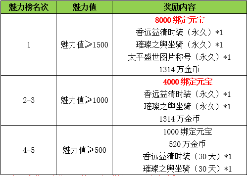 游戏内风云榜-江湖俊杰榜-魅力榜中榜单前5名,且达到最低魅力值要求的玩家将获得如下对应奖励:(所有奖励绑定)。