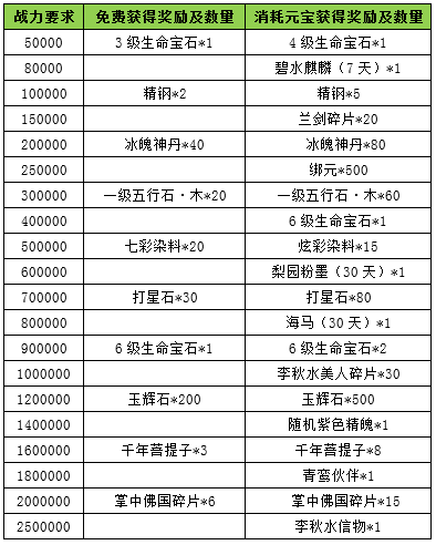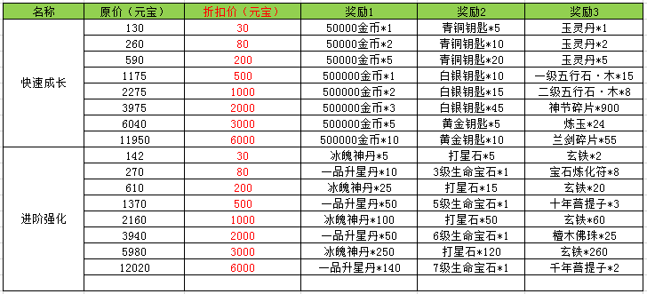 l 活动内容:玩家可以通过较低的元宝获得更高价值的成长道具和强化道具。