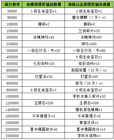 l 活动规则:新服放利活动,增加战力奖励,符合条件的玩家可免费领取,消耗一定元宝还可领取进阶好礼,进阶好礼仅需1次绑定元宝解锁。