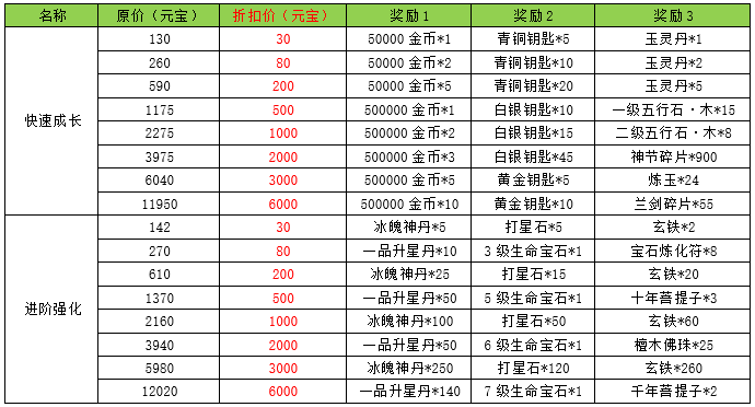活动内容:玩家可以通过较低的元宝获得更高价值的成长道具和强化道具。