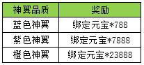 活动内容:活动期间内,神翼达到特定等级,将获得额外绑定元宝。