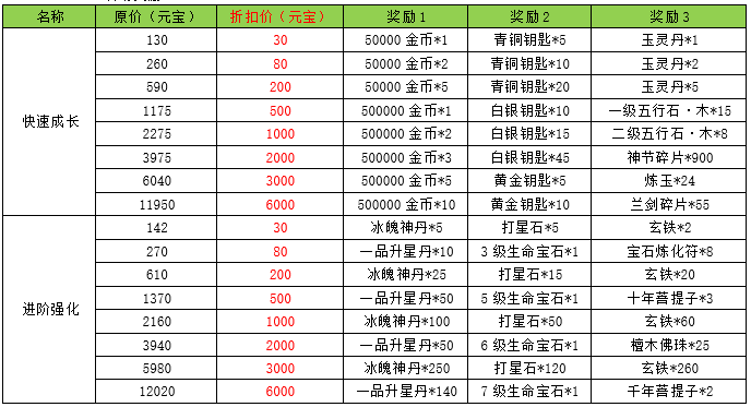 活动内容:玩家可以通过较低的元宝获得更高价值的成长道具和强化道具。