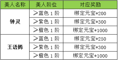 活动内容:活动期间内,拥有钟灵和王语嫣,且提升至目标品阶则可领取奖励。
