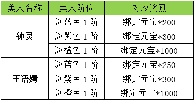 活动内容:活动期间内,拥有钟灵和王语嫣,且提升至目标品阶则可领取奖励。