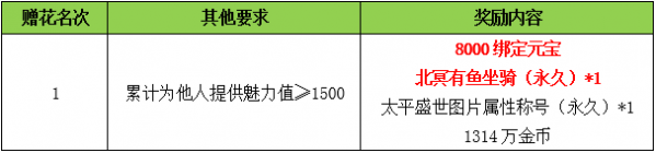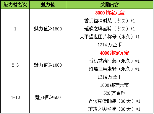 备注:获得奖励的首要条件需符合魅力榜名次要求,同时需要符合对应魅力值要求。若魅力值不符合条件,则不能获得本名次对应奖励,只能获得下一档名次奖励。