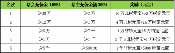 活动期间内,将以帮派为单位进行充值评比,符合以下全部条件,其帮主可领取非绑定元宝+绑定元宝奖励。