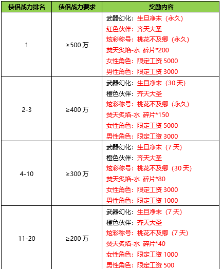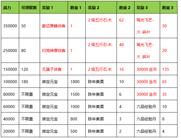 活动期间内玩家拥有的侠客战力达到要求,可以获得对应的奖励。