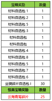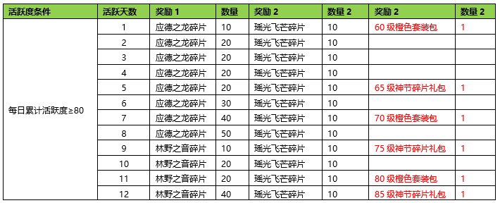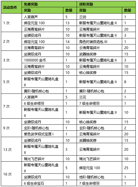 | 星期 | 活动条件 | 奖励名称 | 数量 |