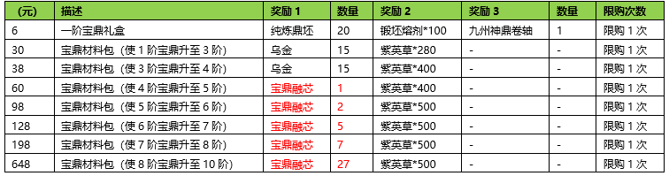 10阶初级宝鼎礼盒:开启后随机获得1个战力在80万-120万间的10阶九州宝鼎。