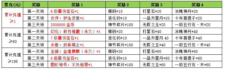 活动奖励:满足要求的玩家请在开服礼->充值赠礼界面领取奖励!