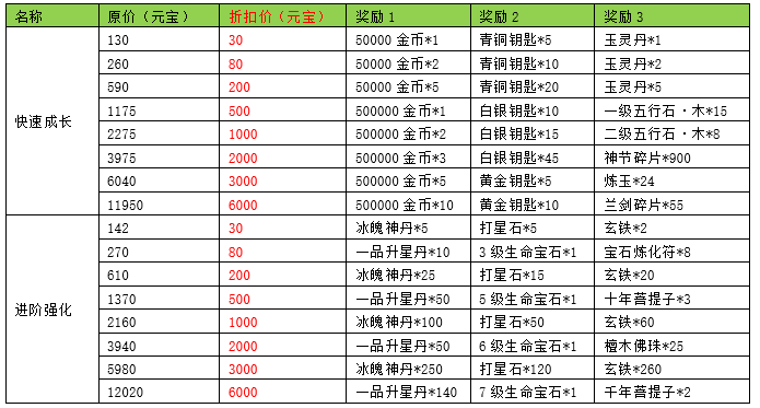 活动内容:玩家可以通过较低的元宝获得更高价值的成长道具和强化道具。