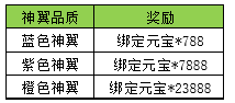 活动内容:活动期间内,神翼达到特定等级,将获得额外绑定元宝。