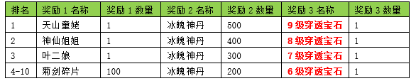 | 128 | 神仙姐姐 | 1 | 冰魄神丹 | 300 | 100000金币 | 10 | ||