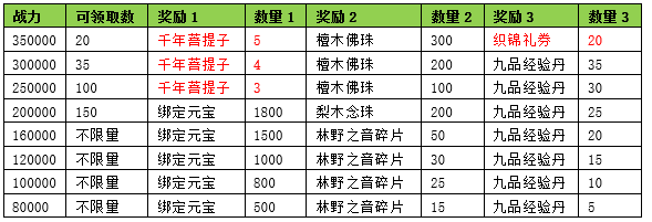 活动期间内玩家拥有的五行珠战力达到要求,可以获得对应的奖励。