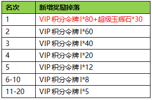 活动奖励:新增加VIP积分掉落;即:在原来活动奖励基础上(如原伤害排名第1核心奖励1200绑定元宝+其他奖励),伤害排名前20的队伍奖励新增VIP积分掉落。