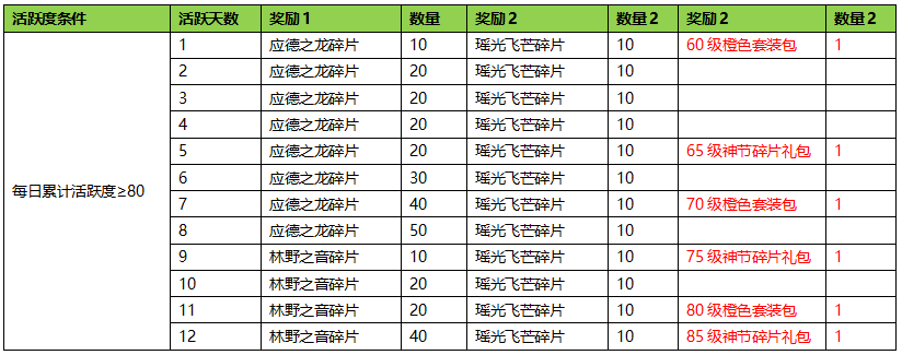 1.活动期间内玩家活跃条件达到指定要求可以领橙色装备+橙色装备打造+瑶光飞芒碎片+仙羽碎片。