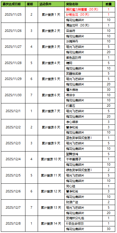 活动时间:11月25日开服后-12月8日23:59(14天)