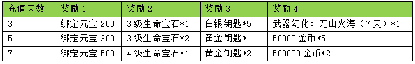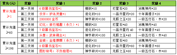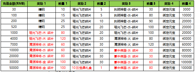 活动内容:活动期间内玩家充值金额满足对应档位,将获得对应奖励。