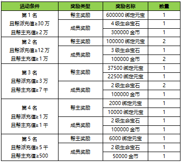 活动期间内以帮派为单位进行评比,帮派充值金额满足要求,且是服务器内前5名,同时帮主充值金额符合条件,帮主及帮派成员均可获得奖励;
