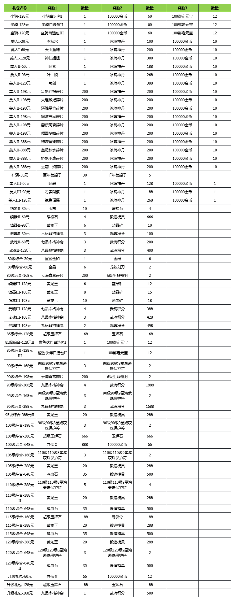 举例:坐骑、美人I、美人II、神翼、宝鼎材料礼包将在11月25日-12月1日上架;美人III、镇器II、武魂II、80级、85级综合礼包、升级礼包礼包将在12月2日-12月8日上架;镇器III、武魂III、90级、95级、升级礼包将在12月9日-12月15日上架,100级综合、升级礼包将在12月16日-12月22日上架;其他等级礼包与升级礼包上架时间以此类推……