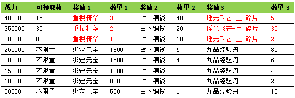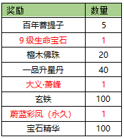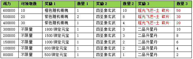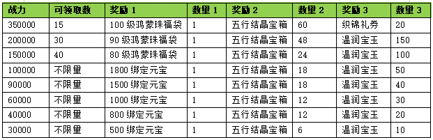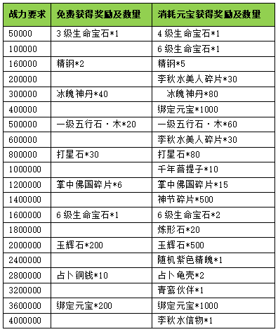 活动期间内玩家拥有的五行珠战力达到要求,可以获得对应的奖励。