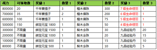 活动期间内玩家拥有的神翼战力达到要求,可以获得对应的奖励。