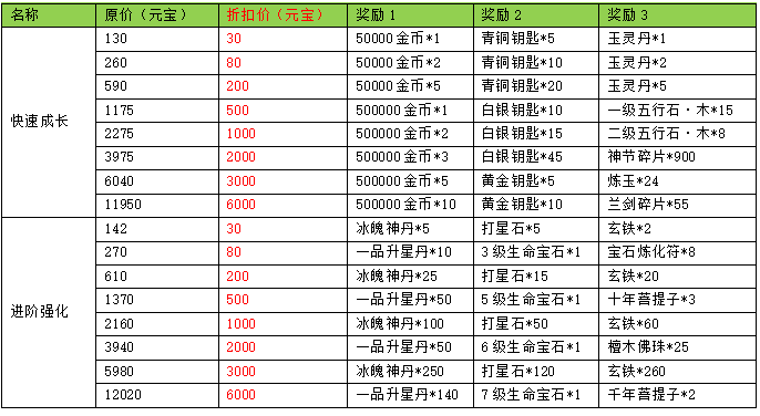 活动内容:玩家可以通过较低的元宝获得更高价值的成长道具和强化道具。