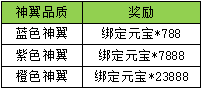活动内容:活动期间内,神翼达到特定等级,将获得额外绑定元宝。