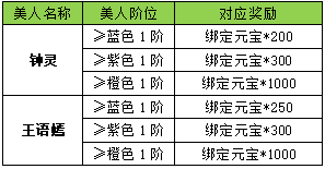 活动内容:活动期间内,拥有钟灵和王语嫣,且提升至目标品阶则可领取奖励。