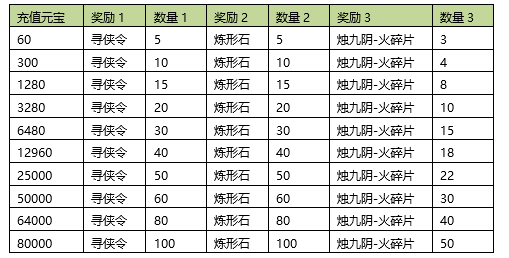 4. 本次充值最高档位80000元宝,所有奖励向上兼容。即充值8000RMB可领取所有奖励;