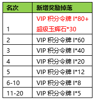 活动奖励:新增加VIP积分掉落;即:在原来活动奖励基础上(如原伤害排名第1核心奖励1200绑定元宝+其他奖励),伤害排名前20的队伍奖励新增VIP积分掉落。