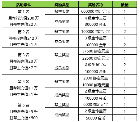 活动期间内以帮派为单位进行评比,帮派充值金额满足要求,且是服务器内前5名,同时帮主充值金额符合条件,帮主及帮派成员均可获得奖励;