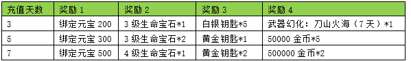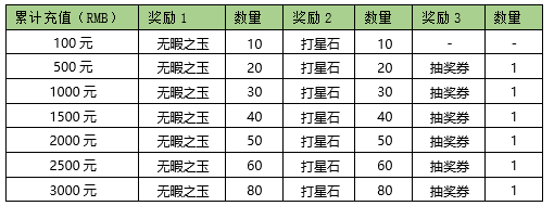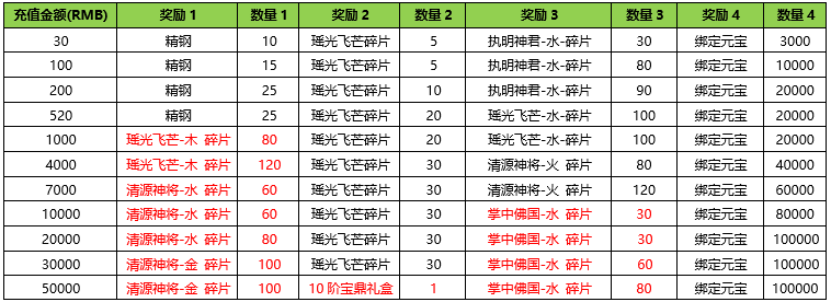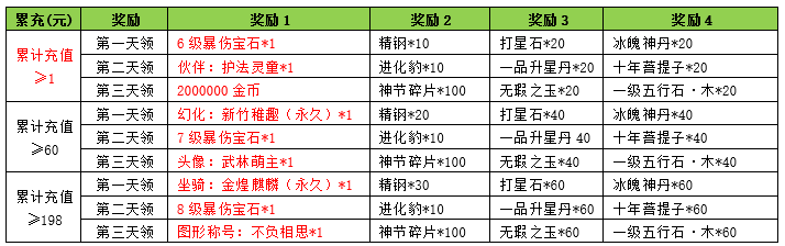活动内容:活动期间内玩家充值金额满足对应档位,将获得对应奖励。