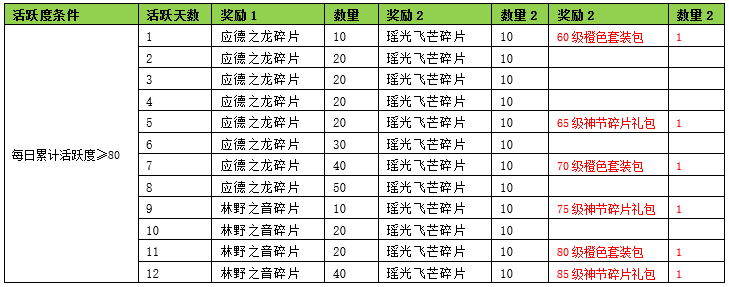 1. 活动期间内玩家活跃条件达到指定要求可以领橙色装备+橙色装备打造+瑶光飞芒碎片+仙羽碎片。
