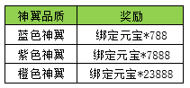 活动内容:活动期间内,神翼达到特定等级,将获得额外绑定元宝。