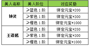 活动期间内玩家拥有的美人战力达到要求,可以获得对应的奖励。