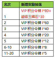活动奖励:新增加VIP积分掉落;即:在原来活动奖励基础上(如原伤害排名第1核心奖励1200绑定元宝+其他奖励),伤害排名前20的队伍奖励新增VIP积分掉落。