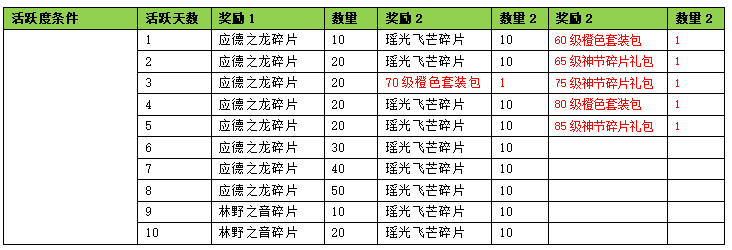 1.活动期间内玩家活跃条件达到指定要求可以领橙色装备+橙色装备打造+瑶光飞芒碎片+仙羽碎片。