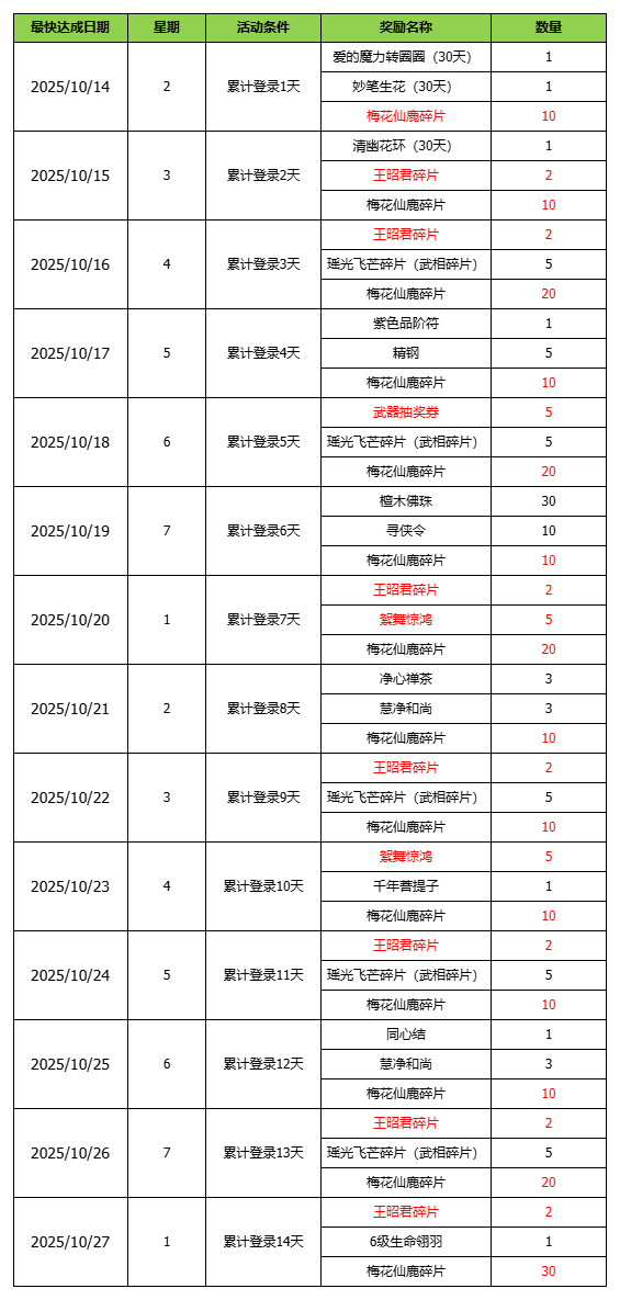 活动时间:10月14日开服后-10月20日(7天)