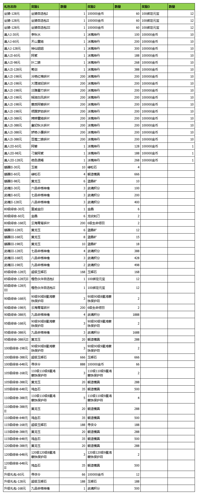 举例:坐骑、美人I、美人II、侠客、神翼、五行珠、镇器、武魂、宝鼎、宝鼎材料礼包将在10月14日-10月6日上架;美人III、镇器II、武魂II、80级、85级综合礼包、升级礼包礼包将在10月7日-10月27日上架;镇器III、武魂III、90级、95级、升级礼包将在10月14日-10月20日上架,100级综合、升级礼包将在10月21日-10月27日上架;其他等级礼包与升级礼包上架时间以此类推……