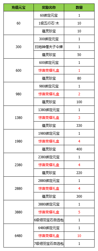 3. 本次充值最高档位6480元宝,所有奖励向上兼容。即充值648RMB可领取所有奖励。